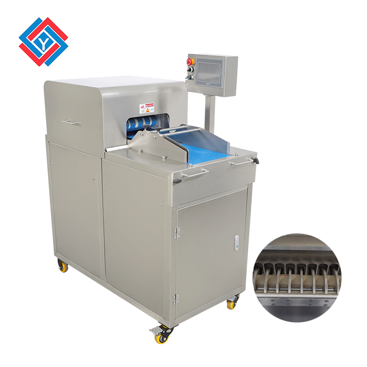 这款切肉丁机整体采用了不锈钢制作,机身钢板厚度达到了3mm,表面使用了抛光拉丝处理工艺,优化卫生方便清洗,切肉丁机的刀片是不锈钢材质,特别淬火加工过后,可用锋利的刀片将鲜肉开条再切块,切割红杀肉块的肉丁迅速且大小均匀,机身同时还采用了快拆式刀组,方便更换加工其他肉类,省去了大量的人工成本。