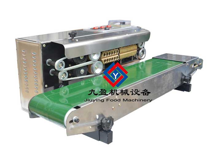 3、当装有物品的包装放置在输送带上,袋的封口部份被自动送入运转中的两根封口带并带入加热区,加热块的热量通过封口带传输到袋的封口部份,使薄膜受热熔软,再通过冷却区,使薄膜表面温度适当下降,然后经过滚花轮(或印字轮)滚压,使封口部份上下塑料薄膜粘合并压制出网状花纹(或印制标志),再由导向橡胶带与输送带将封好的包装袋送出机外,完成封口作业
